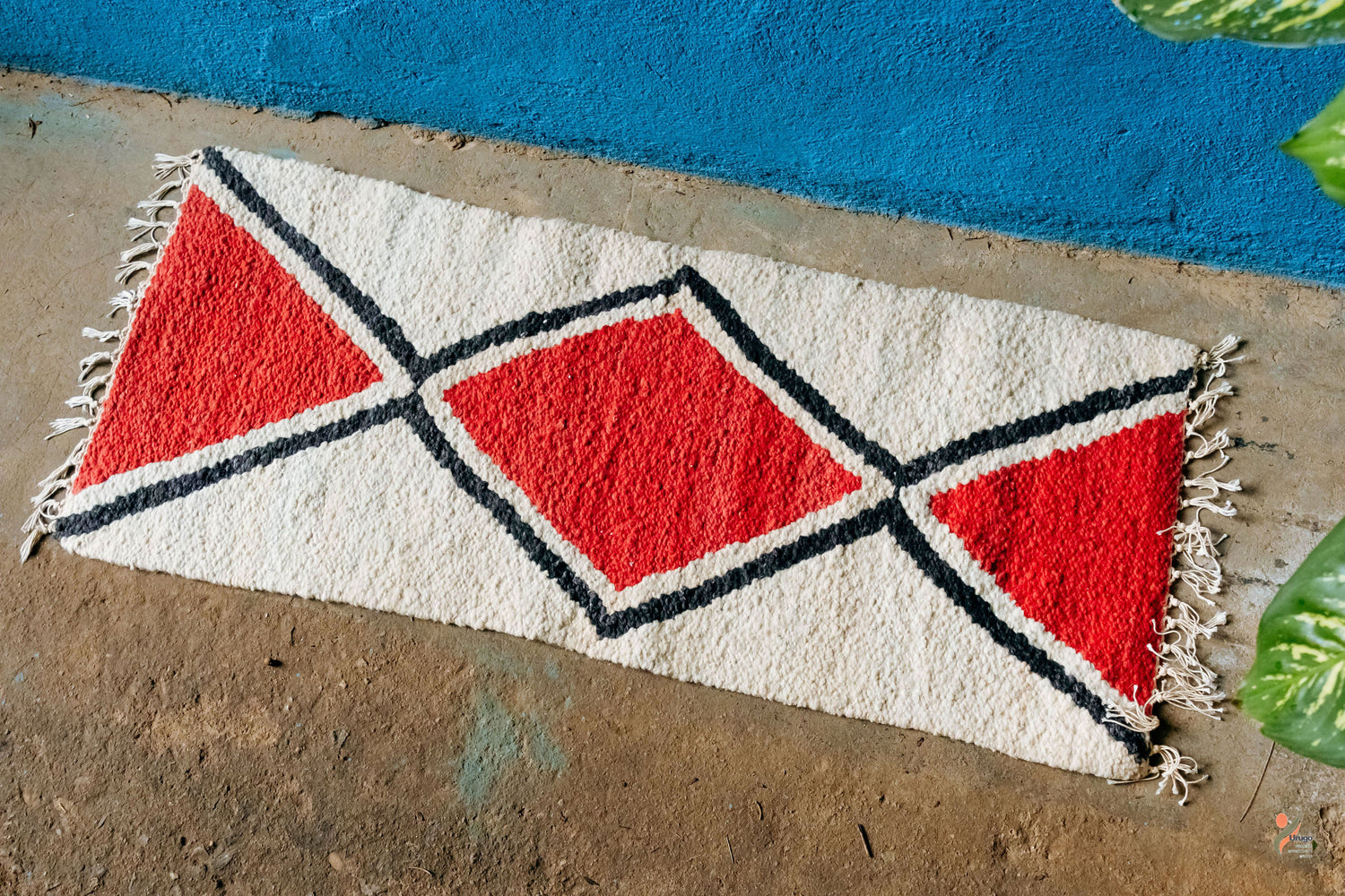 Meticulously woven with care and attention, these one-of-a-kind wool rugs showcase the impressive weaving techniques of Rwandan artisans. The 42x87 cm (16.5x34 in / 1.3x2.8 ft) size is perfect for creating a cozy atmosphere without overwhelming smaller spaces. They make great doormats, bathmats, and wall decorations. A true miracle of craftsmanship and a delight to behold.